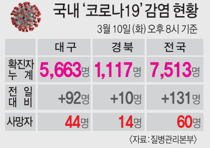 국내에서 신종 코로나바이러스 감염증(코로나19) 확산세가 한풀 꺾인 가운데 국내 확진자 수는 7천513명으로 집계됐다. 대구·경북 지역에서는 하루 동안 102명이 양성으로 판정돼 확진자 감소세를 이어 가고 있다.