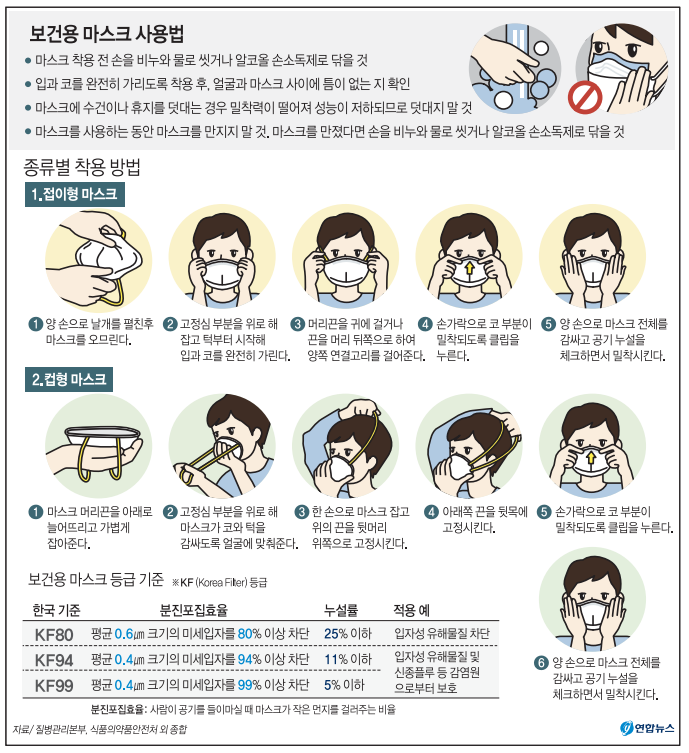 보건 당국은 “보건용 마스크를 오염 우려가 적은 곳에서 일시적으로 사용한 경우 동일인에 한하여 재사용이 가능하다”고 밝히고 환기가 잘되는 깨끗한 곳에 보관한 후 재사용해야 한다고 당부했다.