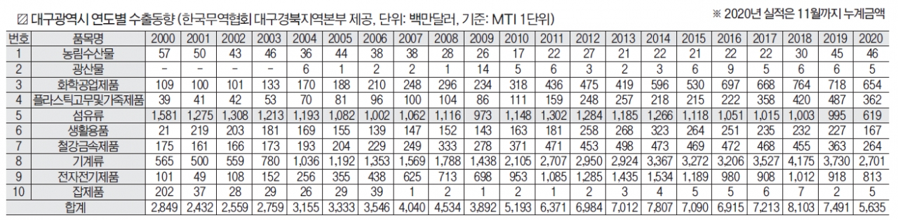 이후 섬유는 우리나라를 수출 주도형 경제로 견인한 일등공신이 된다. 1970~80년 최대 호황을 누렸던 섬유산업에 힘입어 ‘섬유 산업의 메카’로 불렸던 대구의 수출량은 1987년 절정에 달했다.