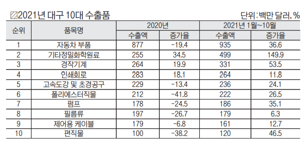 품목별로 살펴보면 대구의 경우 2차전지 소재, 경작기계, 직물 등이 대구 수출 증가를 견인한 것으로 나타났으며, 특히 전기차 전환 확대 영향으로 인한 폭발적인 수요 확대로 양극재 등 2차 전지 소재가 포함된 기타정밀화학원료의 수출증가율은 전년비 149.9%에 달했다. 또한 미국을 중심으로 재택근무 영향에 따른 가드닝(Gardening) 수요가 늘면서 소형 농기계 인기가 큰 폭으로 증가하면서 경작기계 수출의 경우 53.5%가 급증한 것으로 나타났다.