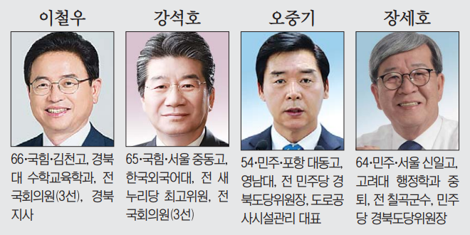 경북은 현직이 3선 임기를 마치는 안동·경산·문경·칠곡·고령지역에 큰 관심이 쏠린다.