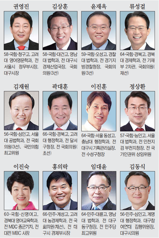 현역 의원 중에는 대구시 경제국장을 지낸 3선 김상훈 의원(서)과 경기지방경찰청장을 역임한 3선 윤재옥(달서을) 의원이 본인의 의사와는 상관없이 거명되고 있다. 또 기획재정부 2차관 출신인 재선 류성걸 의원(동갑)이 경제전문가를 자임하며 출마 의지가 강하다.