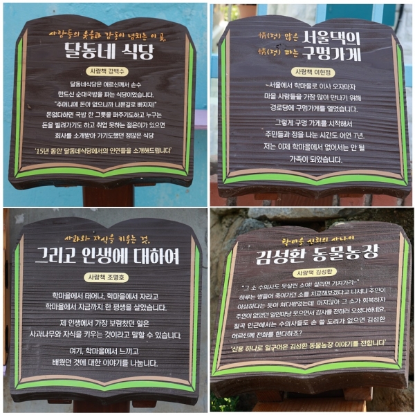 ‘달동네식당’ 강백수 어르신은 15년동안 달동네식당에서 순대국밥을 팔며 만난 인연을 소개해주고 ‘정 많은 서울댁의 정파는 구멍가게’ 이현정 어르신은 경로당에 구멍가게를 열어 주민들과 정을 나눈 이야기를 들려준다. ‘둘 다 퍼주는 스타일이에요 윤영숙’. ‘동물농장 김성환’, ‘와아이라농사법 박진하’, ‘학마을 생생정보통 문희학’ 등 책 제목도 흥미롭다. 마을을 찾기 전 미리 신청을 하면 11명의 마을 어르신이 들려주는 사람책을 만날 수 있다.