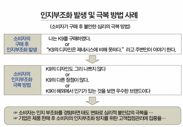 소비자는 제품을 구매 후 불안해하는 경향이 있다. 소비자가 고관여제품 등의 중요한 구매 의사결정을 한 후 불안심리가 생기는 경우는 어떤 상황일까. 가장 흔한 예로써 자신이 선택한 브랜드, 제품이 선택하지 않은 것에 비하여 상대적 단점을 듣게 되는 경우다. 이 경우 인지부조화로 말미암아 심리적 불안상태로 빠져들게 된다. 예를 들어, ‘나는 K9을 구매하였다’라는 인지와 ‘그런데 이 K9의 디자인은 제네시스에 비해 못하다’라는 인지는 부조화를 가져오게 된다. 인지부조화는 구매와 관련된 의사결정과정이 복잡하고 중요할수록 발생되기 쉽다.