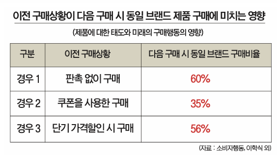 (경우 1) 판촉없이 구매한 소비자가 다음 구매 시 동일 브랜드를 구매할 비율은 60%로 나타났다. 그 브랜드에 대한 선호도로 판촉과 관계없이 구매한 것으로 기인된다. (경우 2) 쿠폰 등의 판촉이 있는 상황에서 구매한 경우, 다음 구매 시 동일 브랜드를 구매할 비율은 35%로 나타났다. 소비자 본인이 해당 제품을 좋아하여 구매한 측면도 있지만 쿠폰 등과 같은 혜택이 더 중요한 역할을 한 경우다.