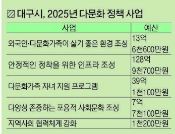 이에 대구시와 구·군도 외국인 주민과 다문화가족의 안정적 정착과 자립을 지원하고, 지역사회와의 소통 강화를 통한 다양성을 존중하는 포용적 사회문화를 조성하기 위해 외국인 주민 및 다문화가족 지원사업을 다양하게 추진하고 있다.